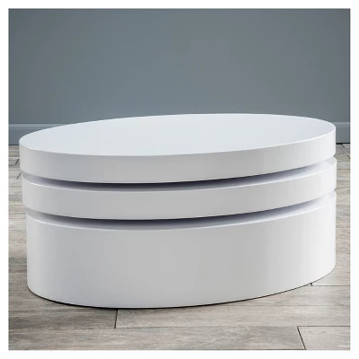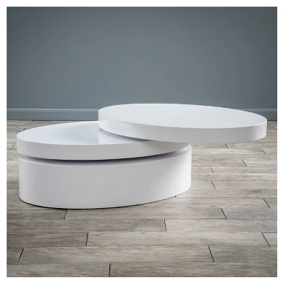 The Christopher Knight Home Carson Small Oval Rotatable Coffee Table offers a clear late 60’s vibe to any room it is placed in. This coffee table has a high gloss white finish that will make a statement to any living room or family room. With a rotating top and extra storage underneath this table is multifunctional and unique. Make a statement in your home with the Christopher Knight Home Carson Small Oval Rotatable Coffee Table . A purchase you will enjoy for years to come.