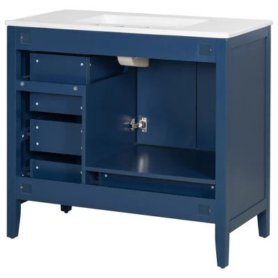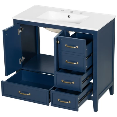 This bathroom vanity seamlessly combines style, functionality, and durability, perfect for any bathroom. Its elegant design, with sleek lines and rust-resistant metal handles, adds modern sophistication, while classic color tones create a stylish focal point. Functionally, the integrated ceramic sink resists stains and is pre-drilled for an 8″ faucet, with a chrome overflow for safety. The multi-tier storage system, including a soft-closing cabinet and multiple drawers, keeps bathrooms organized. An open-back design simplifies plumbing work. Built with a solid pine wood frame and legs, along with high-quality MDF panels, it ensures stability in humid conditions. The waterproof painted finish enhances durability and eases cleaning. In short, this vanity is a complete solution that elevates your bathroom’s style and efficiency, meeting and exceeding expectations for renovations or upgrades.
