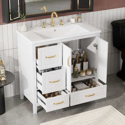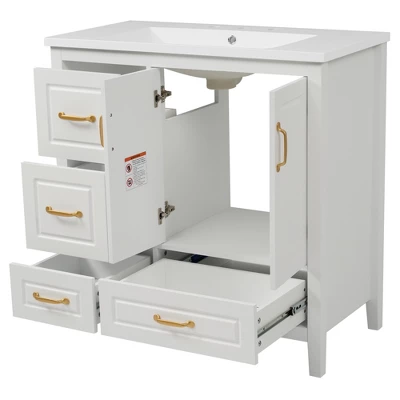 Upgrade your bathroom with this 36-inch freestanding vanity, blending timeless design and modern convenience. Its durable MDF frame and soft resin sink ensure long-term beauty and functionality. Gold-tone handles add elegance, while soft-close drawers and cabinets keep items neatly organized. With an open-back for easy plumbing and a straightforward assembly process, this all-in-one vanity is the perfect balance of form and function for any home renovation.