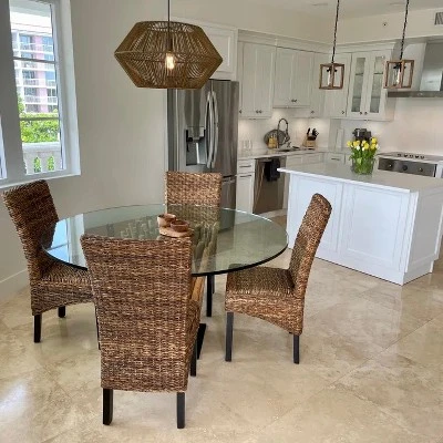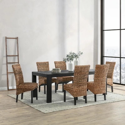 Rich in texture, this dining chair infuses coastal charm into your living room or entertainment area. Built with a solid wood and plywood frame, it supports up to 300 lbs, ensuring durability. The square seat and clean-lined back are wrapped in woven rattan abaca, offering a natural, breezy aesthetic. The sleek black finish on the straight legs adds an understated elegance, making it a versatile piece for any decor. Featuring an inbuilt seat cushion for added comfort, this chair combines style and functionality seamlessly. Whether hosting guests or enjoying a casual meal, this chair serves as a stylish and practical addition to your home, enhancing your space with its unique character and charm.