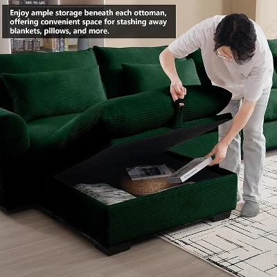 Upgrade your living space with this Big Deep Seat U-Shaped Corduroy Sectional Sofa, designed for both style and comfort. Featuring a spacious four-seater design, this sofa set includes two storage ottomans and four plush waist pillows for an enhanced lounging experience. The durable corduroy fabric adds a touch of sophistication, while its soft texture provides a cozy and inviting feel.The deep and wide seating area offers superior comfort, making it perfect for relaxing after a long day. High-density foam cushions ensure excellent support, while the ergonomic seat angle eliminates fatigue, promoting a sense of security and relaxation.Designed for both comfort and practicality, this sectional sofa includes hidden storage within the ottomans, allowing you to neatly store blankets, pillows, and other essentials. The sturdy wooden frame ensures durability, while its modern design complements various home décor styles.Assembly is simple with all necessary tools included. The package is delivered in seven separate boxes, which may arrive at different times. This versatile, cozy sectional is the perfect addition to any living room, providing both functionality and elegance.