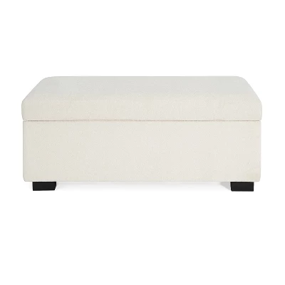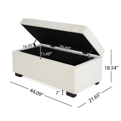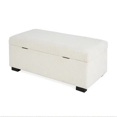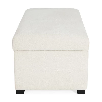 Add both style and function to your living space with this contemporary rectangular storage ottoman. Crafted with a sturdy rubberwood frame, it features a soft upholstered top for comfortable seating and a refined look. The clean lines and minimalist design blend effortlessly into modern interiors, while the hidden storage compartment offers ample space for blankets, pillows, or other essentials. Pressure hinges ensure smooth, hands-free opening and a soft-close lid.