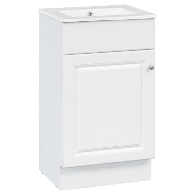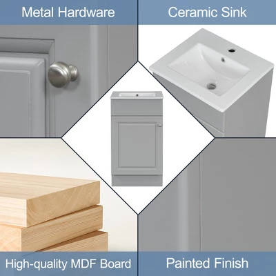 This compact and functional bathroom vanity is designed to maximize space while offering durability and style. Crafted from high-quality MDF, it ensures long-lasting performance. The ceramic sink is easy to maintain, while the painted finish adds an elegant touch and makes cleaning a breeze. The vanity features a spacious cabinet with a door to neatly store your bathroom essentials, keeping them organized and out of sight. Additionally, the built-in storage rack provides extra space for toiletries or accessories, while the adjustable shelf allows for customized organization, accommodating items of varying sizes. Perfect for smaller bathrooms or powder rooms, this vanity combines practicality with modern design, helping you maintain a tidy and stylish bathroom.