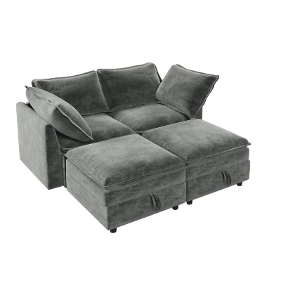 This modular sectional sofa features a sleek and functional design. The frame is made of premium pine, plywood, and iron, ensuring durability and stability. The cushions are filled with 100% polyester for a comfortable seating experience. Its modular design allows for versatile arrangements, and each seat includes hidden storage for added convenience.