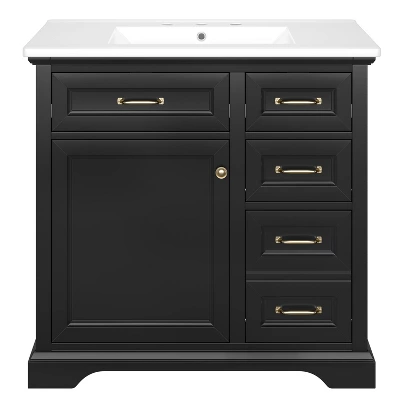 This bathroom vanity combines contemporary design with practical functionality. Crafted from durable materials, it features a smooth, water-resistant ceramic sink. The sleek, modern design includes spacious drawers, providing ample storage for toiletries, towels, and other bathroom essentials, helping keep your space organized and tidy. The cabinet features adjustable shelving, offering flexibility for your storage needs. With a soft-closing mechanism, the drawers and doors operate smoothly and quietly. This vanity enhances any bathroom with its clean lines and contemporary aesthetic, combining style with everyday convenience.